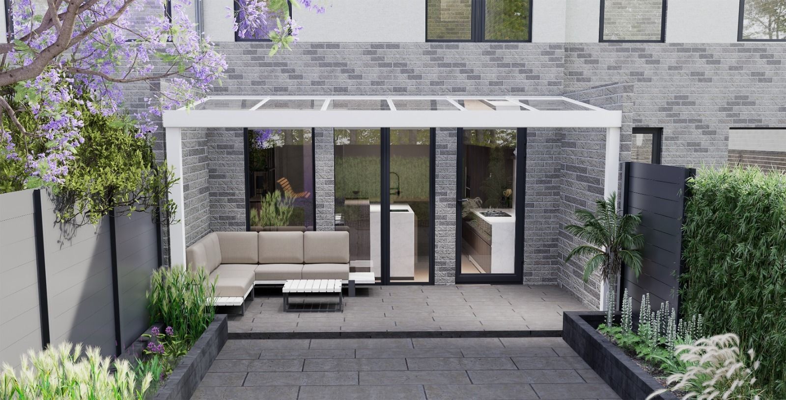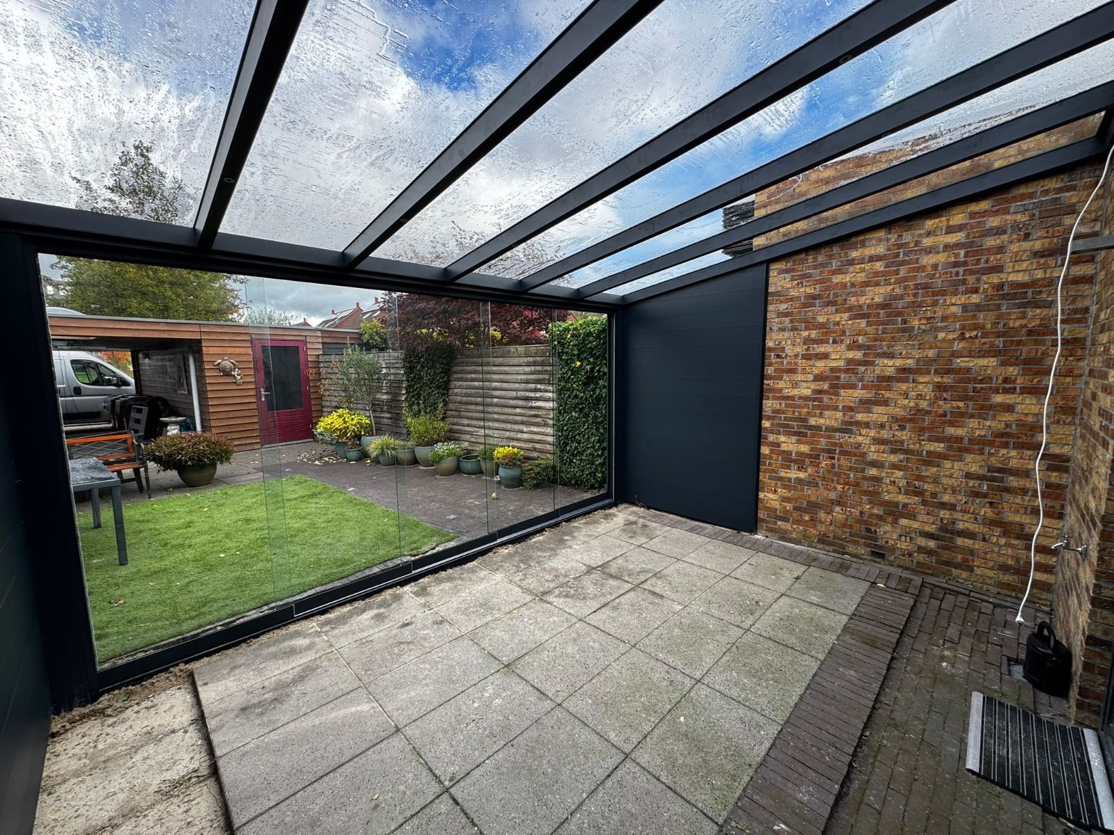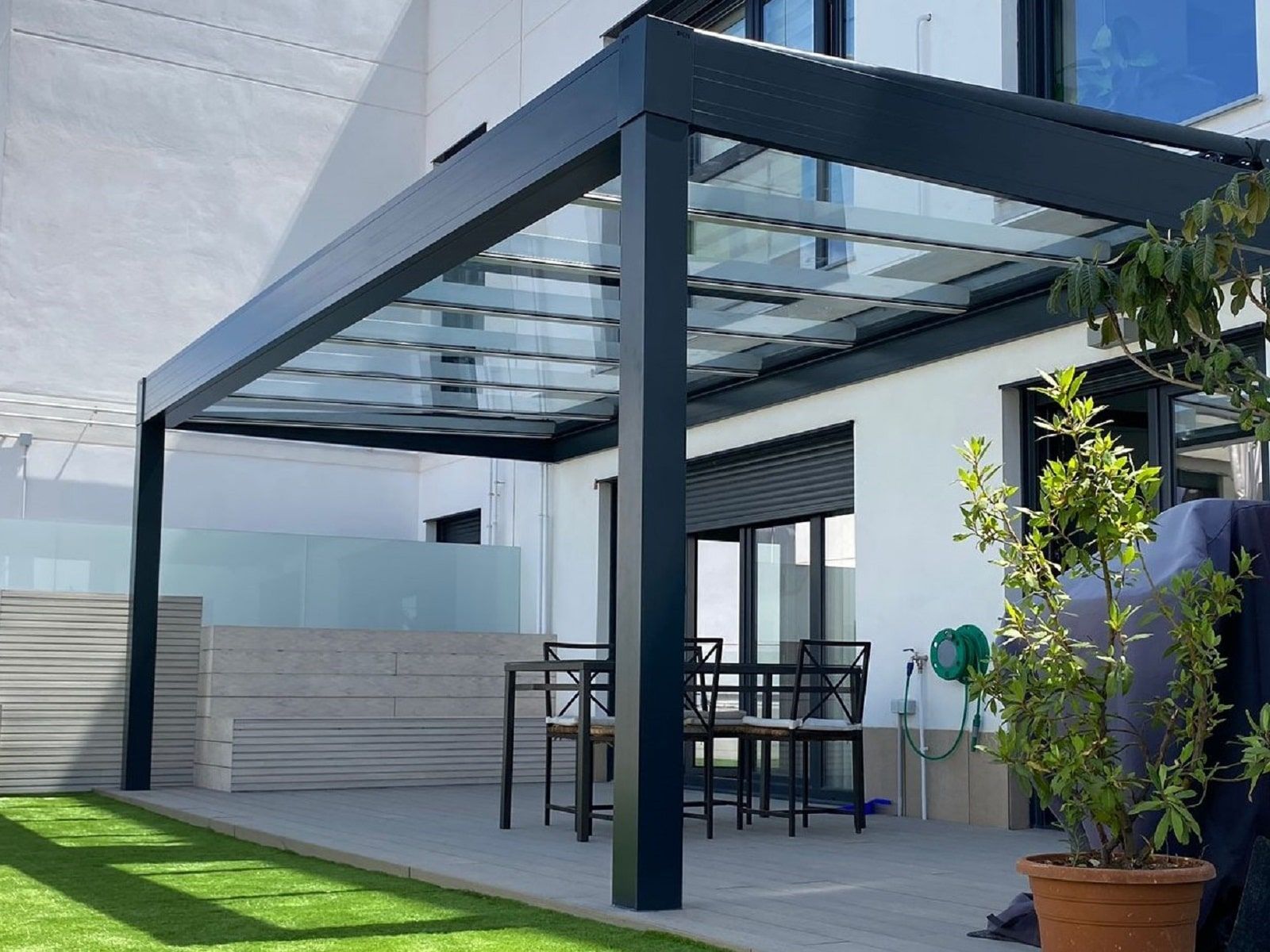 Uno de los principales beneficios del porche acristalado es que permite cerrar el espacio exterior manteniendo la entrada de luz natural. Gracias al uso de vidrio de seguridad y estructuras de aluminio de alta resistencia, se consigue una protección eficaz frente al viento, la lluvia y la humedad, sin crear sensación de encierro.